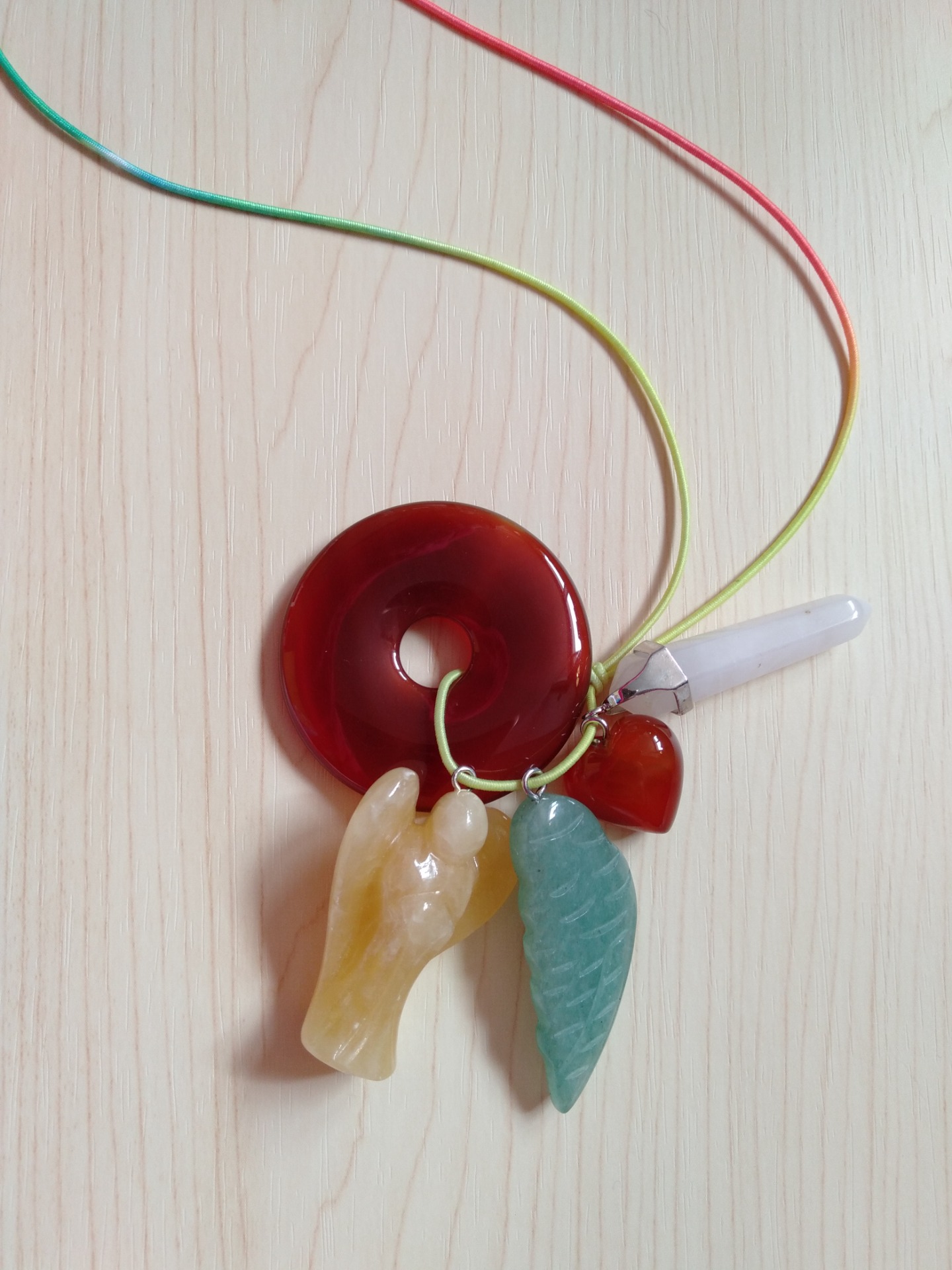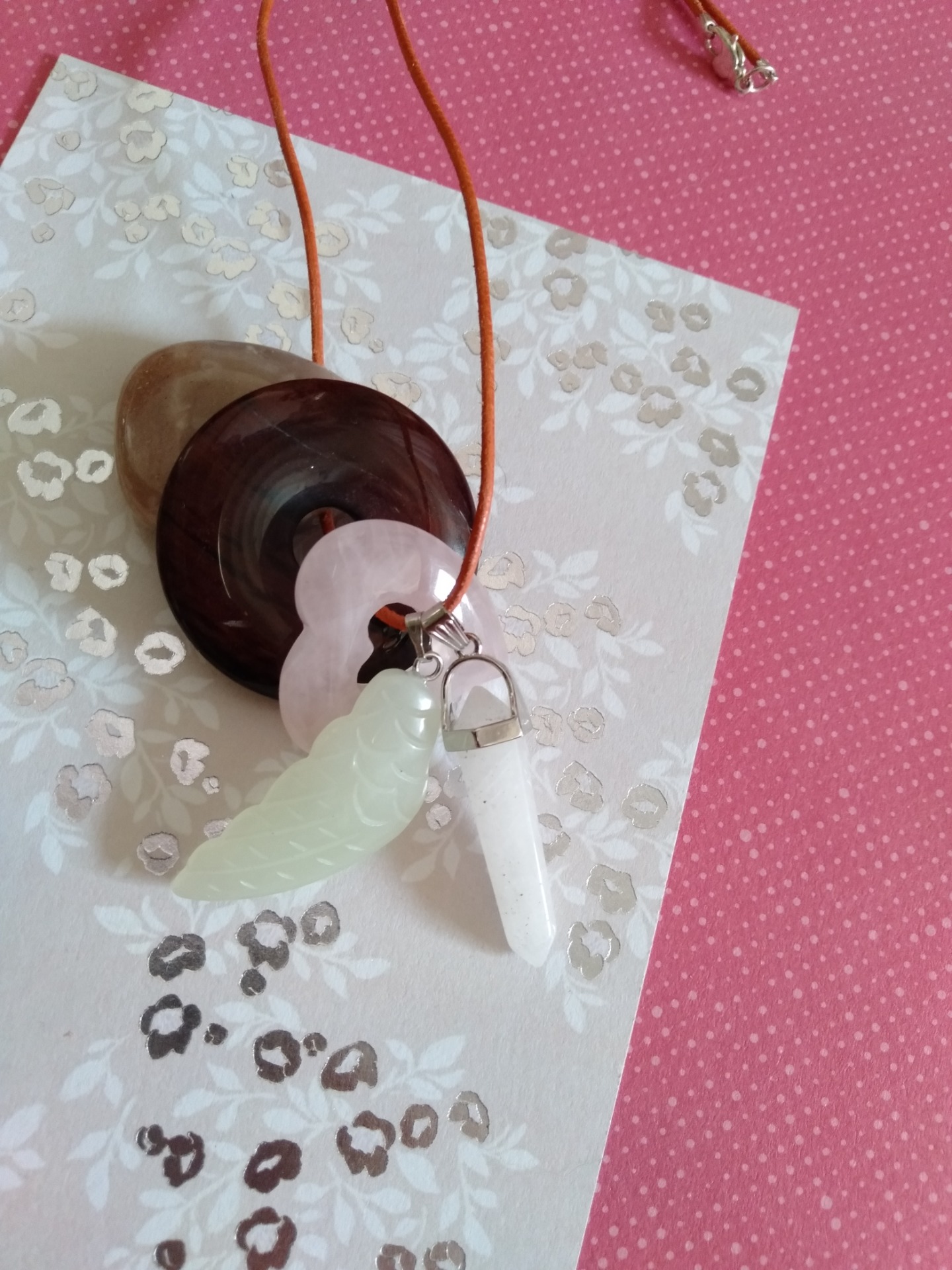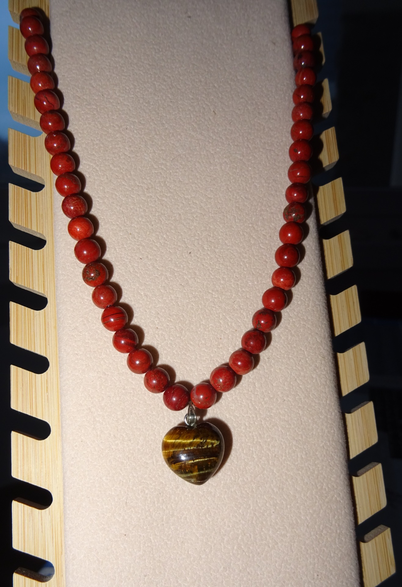Collier court (sous la trachée) composé des pierres naturelles jaspe rouge et oeil de tigre. Pour un ancrage (sentiment d'être terre à terre) et une protection réussies. Le jaspe rouge pousse à l'action, et l'oeil de tigre vous protège des énergies négatives (les vôtres et celles d'autrui). Tarif : 35€ par virement ou chèque, ou 37€ par CB (frais informatique et associés inclus).