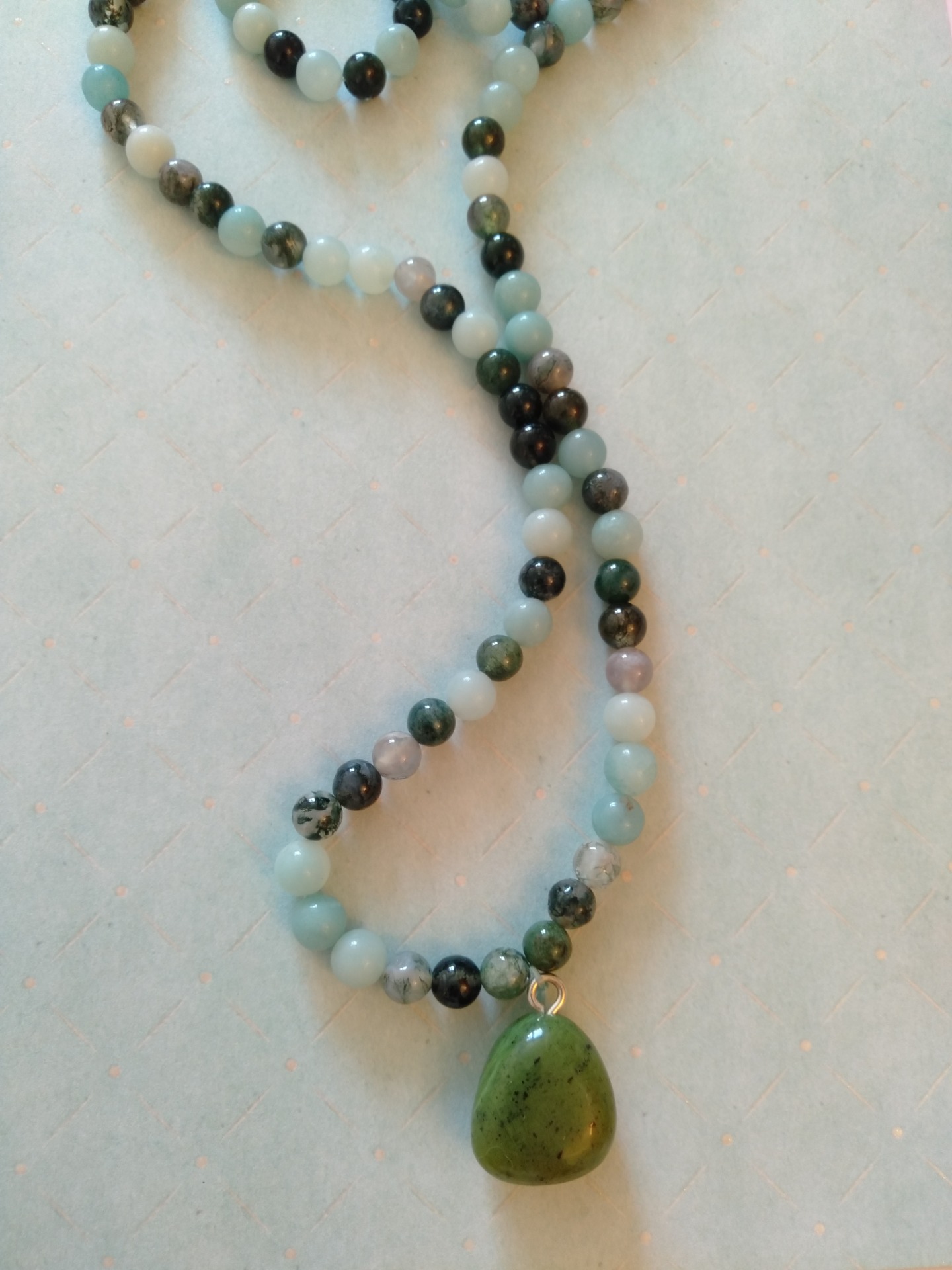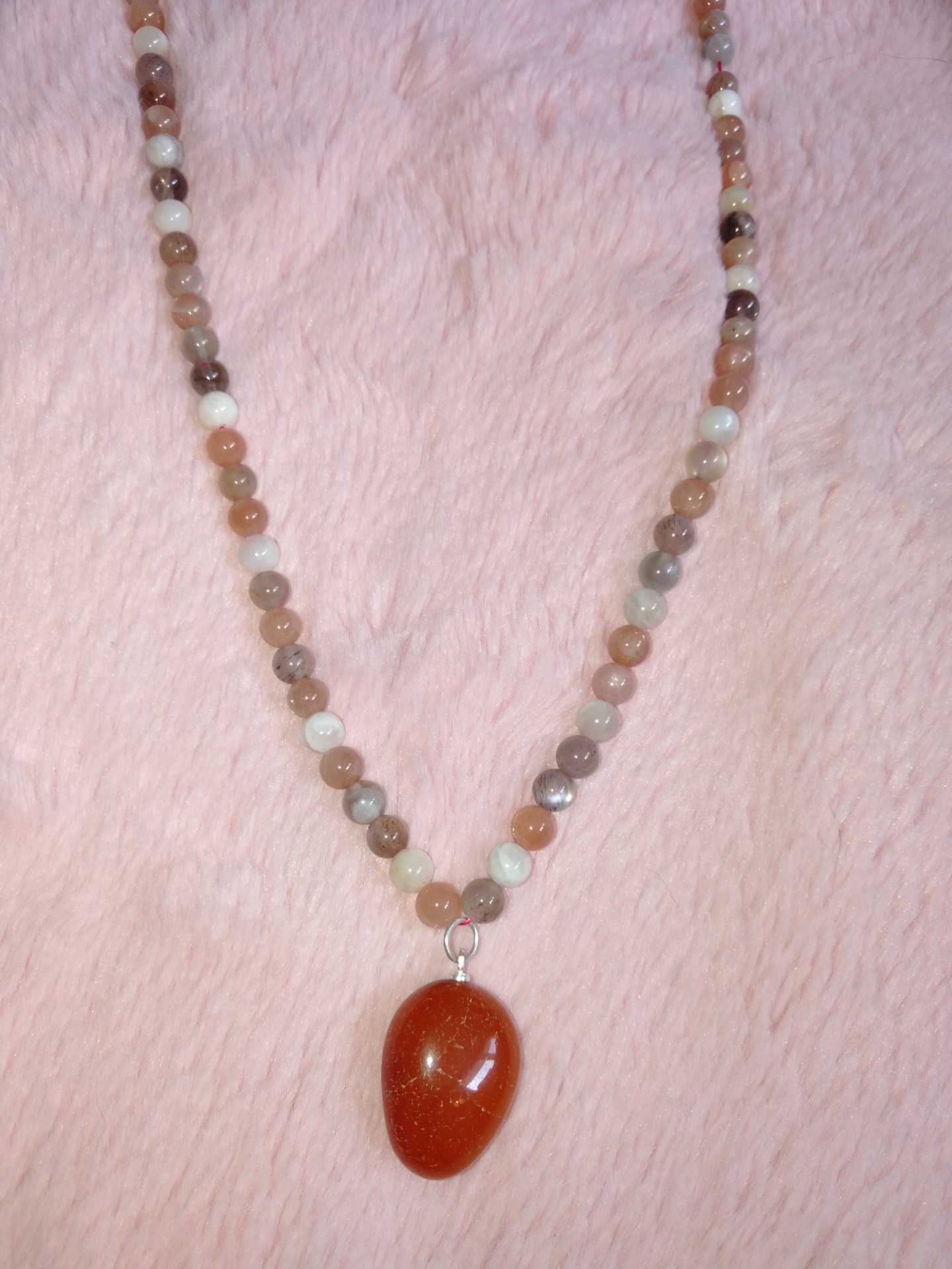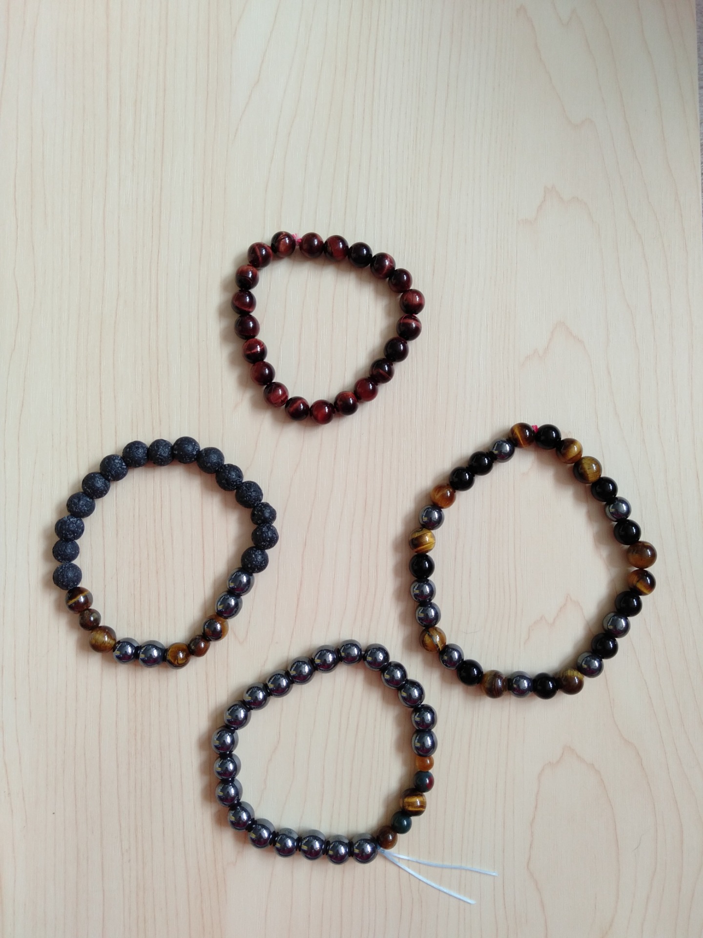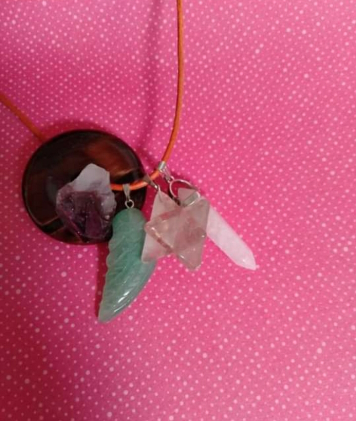 Collier court (sous la trachée) composé des pierres naturelles jaspe rouge et oeil de tigre. Pour un ancrage (sentiment d'être terre à terre) et une protection réussies. Le jaspe rouge pousse à l'action, et l'oeil de tigre vous protège des énergies négatives (les vôtres et celles d'autrui). Tarif : 35€ par virement ou chèque, ou 37€ par CB (frais informatique et associés inclus).